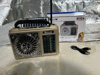 Rádio portátil Golon RX-664S com painel solar integrado. Possui um design clássico e funcional. Rádio portátil Golon RX-664S com painel solar. É um rádio multibanda que capta frequências FM, AM e SW Completo na caixas, sem defeitos ou falhas Nunca usado Golon são portáteis e alimentados por bateria recarregável, pilhas ou energia solar - Painel solar para carregamento. - Antena retrátil para melhor recepção. - Alça para transporte.