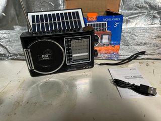 Rádio portátil com design retrô, modelo K-098S. Rádio portátil retrô KSST, modelo K-098S. Na caixa, completo sem defendo Inclui funcionalidades modernas como reprodutor de música USB/TF (cartão). Suporta várias bandas de rádio: AM, FM e SW (ondas curtas). Possui um painel solar integrado para carregamento, visível na parte superior. - Painel solar para carregamento. - Antena extensível para melhor recepção. - Possui entrada para MP3.