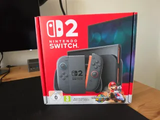 Consola Nintendo Switch 2 com o jogo Mario Kart World incluído. A consola tem um design moderno e elegante. - Inclui jogo Mario Kart World. - Cor cinza e detalhes em vermelho.