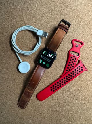 Apple Watch Series 4 de 44 mm, smartwatch com acessórios. Estado cuidadoso, com sinais de uso. Bateria a 78%, dura um dia. - Pulseira de couro marrom. - Pulseira esportiva vermelha. - Carregador magnético.