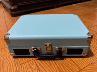 Leitor de vinil portátil em formato de mala, com um design retro e elegante. - Acabamento exterior em azul. - Interior forrado em preto com a inscrição Easy to aspire. - Botões de controlo e entrada para auscultadores. Suporta Radio e Bluetooth Vem sem cabo