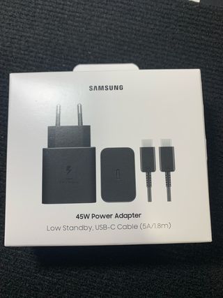 Carregador original Samsung 45W com cabo USB-C. - Carregador rápido de 45W. - Inclui cabo USB-C de 1.8m (5A). - Design compacto e eficiente.