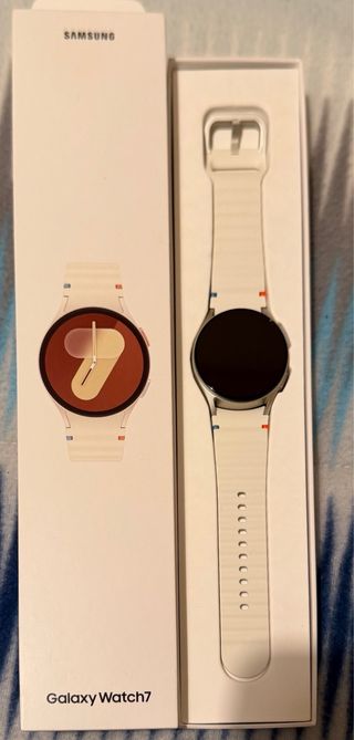Smartwatch Samsung Galaxy Watch 7 em excelente estado. Um relógio elegante e moderno. - Bracelete branca com detalhes coloridos. - Com oferta de 3 películas e outra bracelete tudo novo. - Usado 1 vez tem seguro Samsung care de 1 ano