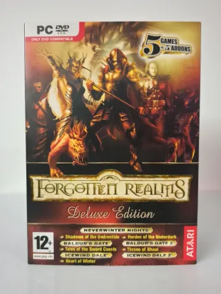 Edição Deluxe de Forgotten Realms para PC em DVD. - Inclui 5 Jogos + 5 Addons. Jogos incluídos: Neverwinter Nights DLC's: -Shadows of the Undrentide - Hordes of the Underdark Baldur's Gate DLC's: - Tales of the Sword Coasts - Throne of Bhaal Icewind Dale DLC's: - Heart of Winter Icewind Dale 2. - Apenas compatível com DVD. - Classificação etária: 12+ Ótimo para coleccionador, nunca foram jogados, estiveram guardados e esquecidos.