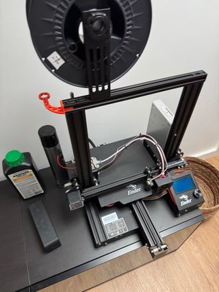 Impressora 3D Ender 3 Pro em bom estado, com alguns acessórios adicionais. - Suporte para rolo de filamento. - kit de nivelamento - Base preta adicional. Placa já atualizada (posso incluir a anterior por valor adicional) Alteradas peças de ajuste para metalicas (melhorou a vibração)