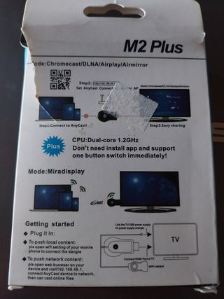 Pronto para um novo lar! Este AnyCast M2 Plus é um receptor de exibição WiFi. Em ótimo estado. - Permite espelhamento de tela de dispositivos móveis para TV. - Compatível com Miracast, AirPlay e DLNA. - Inclui 1 dongle. -Caixa original. -Nenhum uso.