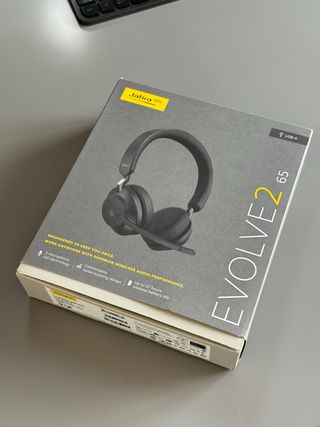 Auriculares Jabra Evolve2 65 com design moderno e elegante totalmente nuevos. - Tecnologia de 3 microfones para chamadas nítidas. - Design confortável com isolamento de ruído. - Até 37 horas de autonomia de bateria sem fios. - Conexão USB-C a USB-A.