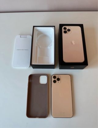 iPhone 11 Pro na cor dourada. - Três câmaras traseiras. - Acabamento em vidro e aço inoxidável.