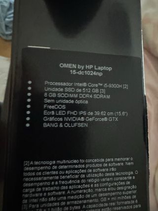 Potente e elegante, o Hp Omen 15 é a escolha certa para jogadores exigentes. Com um design arrojado e desempenho incrível, este portátil garante horas de entretenimento sem falhas. Como novo, sem marcas e com poucas horas de uso. Comprado em setembro de 2022 na Worten. Especificações Técnicas: - Ecrã: 15.6” 144Hz - Placa Gráfica: NVIDIA GeForce RTX 3060 - Processador: Intel Core i7-10870H (2.20GHz) - Memória RAM: 64GB - Armazenamento: SSD 1TB - Inclui carregador original Valor pouco negociável. Não estou interessado em trocas. Qualquer dúvida não hesite em contactar.