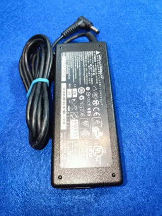 Carregador da marca Delta Electronics. Entrada (Input): 100-240 V~, 1.3 A, 50-60 Hz. Saída (Output): 19 V, 3.95 A. - Cor preta. - Design retangular.