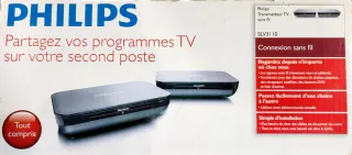 Kit transmissor e receptor de TV sem fio da Philips, modelo SLV3110. Permite compartilhar seus programas de TV em um segundo aparelho. - Conexão sem fio. - Sinais atravessam paredes e tetos. - Funciona com decodificadores, receptores de satélite, leitores de DVD e outros. - Utilize seu controle remoto atual. - Fácil instalação, sem necessidade de cabos ou furos.