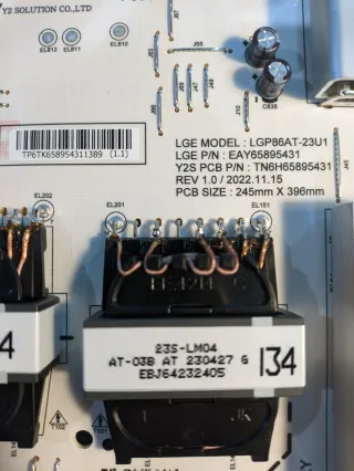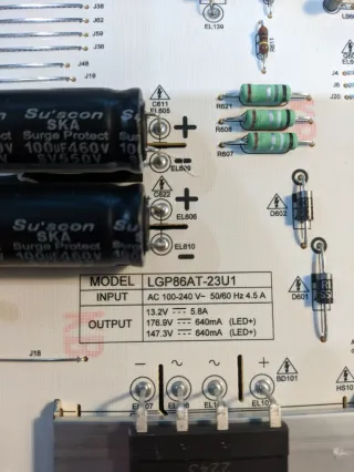 Fonte de alimentação para TV LG, modelo LGP86AT-23U1. P/N: EAY65895431 - Entrada: AC 100-240V ~ 50/60 Hz 4.5 A - Saída: 13.2V --- 5.8A - Saída: 176.9V --- 640mA (LED+) - Saída: 147.3V --- 640mA (LED+)