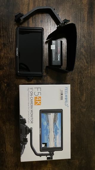 Monitor FEELWORLD F5 4K. - Resolução 4K. - Ecrã de 5 polegadas. - Inclui suporte para montagem. -Oferta de uma bateria