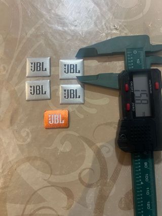Conjunto de 5 emblemas JBL para carros, ideales para sistemas Hifi. Estos emblemas son nuevos y aportan un toque distintivo a tu vehículo. - Emblemas con logo JBL. - Acabado plateado y uno naranja. - em alumino com cola 3M dupla face