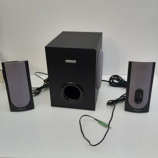 Por favor, para facilitar, leia a descrição toda do anúncio. Qualquer dúvida, contacte. Visite os meus outros anúncios, tenho centenas de artigos para vender. Em muito bom estado geral. 100% Funcionais Utilizáveis. Pequenas marcas normais do uso e do tempo. Com o respectivo transformador original, prontas a funcionar. Ligação por jack de 3,5mm, indicado para computador, também funcionam em telemóveis, tablets, etc, que tenham saída de som idêntica. Sistema 2.1 com subwoofer de 6w RMS e duas colunas de 3w RMS cada, isoladas de magnetismo, para não interferir com monitores. Controles de volume, baixos e on/off. Filipe Fatal