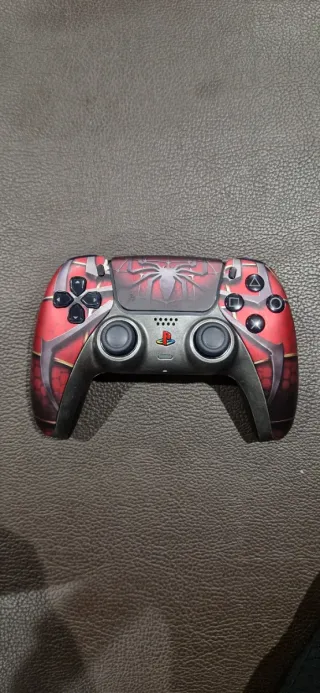 Comando de PS5 com design personalizado inspirado no Homem-Aranha. - Design temático do Homem-Aranha. - Cores vibrantes em vermelho e preto. - Detalhes metálicos. - Acabamento fosco. - Comando levou 2 analógicos magnéticos, anti drift.