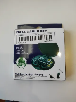 Conjunto de cabos de carregamento e dados multifuncional. - Inclui 5 tipos de conectores: USB para C, USB para iPhone, Type C para C, Type C para iPhone e Type C para Micro. - Cor: Ivory White. - Inclui pin para remover cartão SIM. - Caixa de arrumação redonda, compacta e portátil.