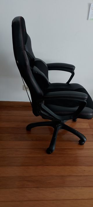 Cadeira de gaming em preto com detalhes em vermelho. - Design ergonómico. - Apoios de braço. - Base com rodas. A cadeira encontra-se em bom estado geral, mas tem uma pequena abertura e alguns riscos na parte direita, visíveis nas fotos. Nada que comprometa a utilização. Entrega em mão. Para mais informações, envie mensagem.