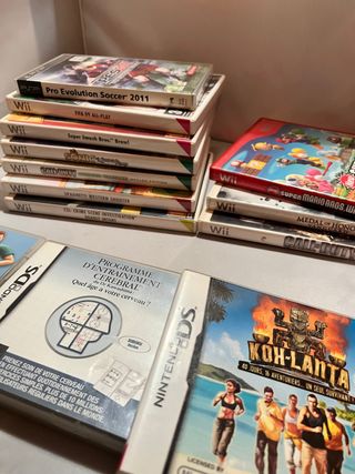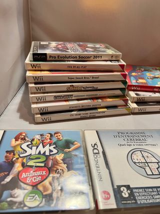 Conjunto de 13 jogos para consolas Nintendo Wii, Nintendo DS e Psp. Atenção! Os 3 jogos Wii em separado são região América NTSC - Pro Evolution Soccer 2011 (PSP) - FIFA 09 All-Play (Wii) - Super Smash Bros. Brawl (Wii) - Sonic (Wii) - Call of Duty 3 (Wii) NTSC - Call of Duty Modern Warfare (Wii) - Spaghetti Western Shooter (Wii) - CSI: Crime Scene Investigation Deadly Intent (Wii) - Programme d'Entrainement Cérébral (Nintendo DS) - Medal of Honor Vanguard (Wii) NTSC - Super Mario Bros. Wii (Wii) NTSC - Koh-Lanta (Nintendo DS) - Sims 2 Animais e Companhia (Nintendo DS)