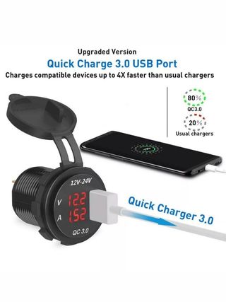 Carregador usb automóvel com 1 porta USB Quick charge 3.0 ( carregamento rápido) Com mostrador de tensão de bateria e corrente de carregamento. Iluminação em Led vermelho. Tensão de entrada: 12/24V Tensão saída: 5V/3A Possui dois terminais isolados para ligação. Para instalação direta em isqueiro do carro ou noutro local ( tendo de ser aberto um furo e passagem dos cabos necessários) Quantidade: 2 unidades Estado: novo