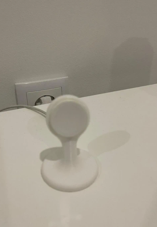 Práctico soporte para iPhone que se conecta directamente al enchufe de pared. Permite cargar tu teléfono de forma segura y ordenada. - Diseño compacto y funcional. - Color preto ou branco - Incluye un recorte con el logo de Apple.