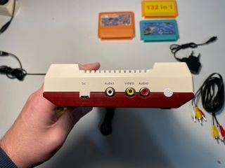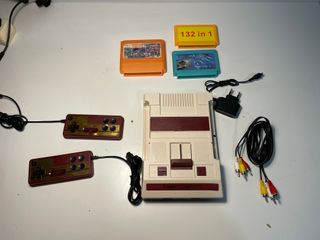 Consola de videojogos retro Family Computer. - Inclui dois comandos. - Inclui fonte de alimentação e cabos AV. - Inclui 3 cartuchos de jogos.