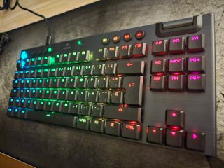 Teclado gaming wireless low profile novo, aberto só para fotos. Como novo na caixa. Switches GL tactile brown, layout QWERTY ISO Espanhol. Iluminação RGB Lightsync. Keycaps double shot PBT. Conectividade tripla (cabo, RF, Bluetooth). Physical Specifications Length: 368 mm Width: 150 mm Height: 22.6 mm Weight (w/o cable): 860 g Cable length: 1.8 m