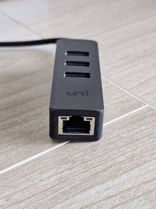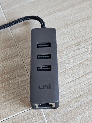 Adaptador de conexión UNI con puertos USB 3.0 y conexión Ethernet RJ45. - Diseño compacto y moderno. - Tres puertos USB 3.0. - Un puerto Ethernet RJ45.
