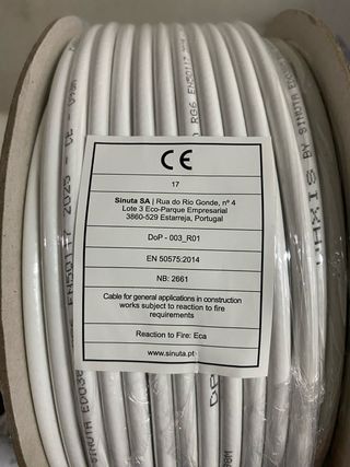 Cabo coaxial RG6 branco, em bobine de 100 metros. - Modelo Tri-Shield. - Condutor interior em Aço Cobreado 1,02 mm. - Blindagem tripla. - Cobertura de malha Al > 70%. - Revestimento exterior em PVC UV. - Norma EN 50117.