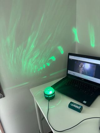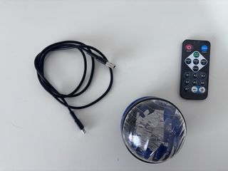 Luz LED giratória com vários modos de iluminação e controlo remoto. - Inclui cabo de alimentação. - Controlo remoto com botões para modo, cor e efeitos. - Design compacto e portátil.