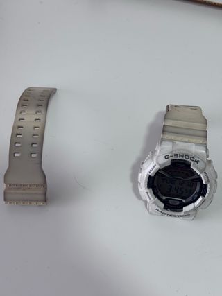 Relógio G-Shock com pulseira separada. - Caixa branca. - Pulseira em tom neutro.