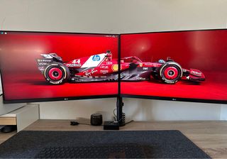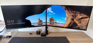 Conjunto de dois monitores LG de 27 polegadas, ideal para um setup de trabalho ou simulador. - Inclui suporte para vesa da Ewent.