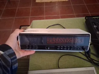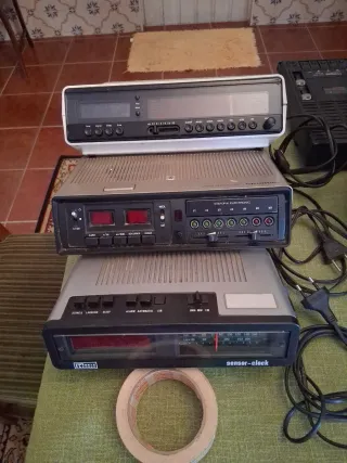 Rádio despertador com um design retro, perfeito para colecionadores ou para quem procura um toque vintage. - Apresenta um acabamento em preto e cinza. - Inclui botões de controlo na parte frontal. - Pode precisar pequena reparacao