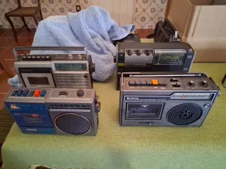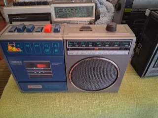 Rádio cassete vintage em bom estado, com um design clássico. - Apresenta botões de controlo para funções de cassete. - Inclui rádio AM/FM. - Alça para transporte.