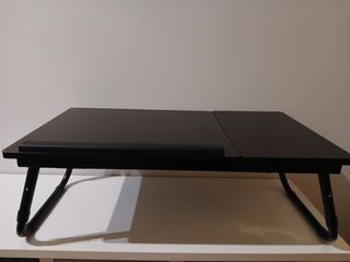 Mesa/suporte portátil para computador. A mesa possui uma zona fixa mais pequena (para o rato) e uma zona reclinável em cinco posições, com barra de contenção no extremo. Possui tampo em madeira com tratamento preto e pés metálicos pretos ajustáveis. Os pés são ajustáveis em duas alturas distintas - 22 e 26cm. A mesa fecha completamente para facilitar a arrumação. Mesa de 60x34,5cm e altura ajustável. Tampo fixo da mesa: 20x34,5cm. Tampo reclinável da mesa: 40x34,5cm (com batente de madeira no extremo). Possui proteção plástica na zona onde os pés acentam na superfície. Usada apenas duas vezes. Está como nova.