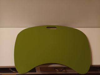 Suporte para computador portátil com almofada na parte inferior. Base ergonómica com 48cm de comprimento máximo, 35cm de largura máxima e 33cm de largura mínima. Com 3,5cm de altura. Com pega para facilitar o transporte. Tampo verde com almofada preta. Usado em bom estado.