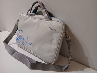 Mala para notebook ou tablet, cinza claro com apontamentos de azul forte. Interior almofadado cinza e fechos metálicos. Bolsa exterior com fecho. Bolsa interior com divisória amovível, com possibilidade de ser colocada em diversas posições (possui velcro). Com alça para transporte à mão ou alça grande para transporte ao ombro, esta última amovível e regulável. Mala de 33x22cm e 4cm de espessura. Usada em muito bom estado.