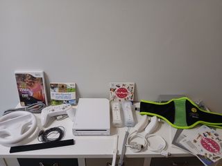 Consola Nintendo Wii branca, modelo RVL-101 (EUT) de 2012. Inclui: - Consola branca de 21,5x15,5cm e 4,5cm de altura e respetivos cabos de ligação A consola permite posicionamento na vertical ou na horizontal. - Volante branco. - Comando clássico, com duplo joystick e botões brancos - Dois comandos Nunchuk, com joystick em branco - Dois comandos de movimento Motion Plus, com proteção anti-choque.Jogos Wii Party e Wii Sports, com os respetivos manuais. - Manual de instruções; Jogo Zumba Fitness com o respetivo cinto para aplicação do comando Motion Plus (cinto ajustável). Wii usada poucas vezes. Está como nova.