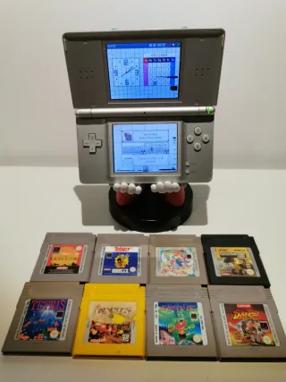 Conjunto de 8 cartuchos de jogos para Game Boy e um Nintendo DS. - Jogos incluídos: Lion King, Asterix, Tetris, DuckTales, Construction Zone, Gargoyles, e mais dois. - Nintendo DS em cor cinza. O nintendo vai lendo os cartões DS e os cartuchos advance. Apresente linhas pretas nos ecrãs. Sem caneta e sem carregador