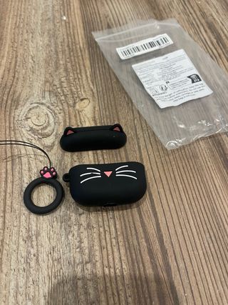 Conjunto de capas protetoras para Airpods Pro com design de gato preto. - Capa principal com detalhes de rosto de gato. - Capa adicional menor. - Anel de transporte com detalhe de pata de gato.