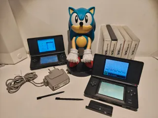 Duas Consolas portátil Nintendo DS Lite na cor preta. - Inclui carregador. - Inclui duas canetas stylus. Não são de DS - Inclui 5 jogos Nintendo DS. Uma das consolas tem problema de contacto no ecrã de cima, a outra no de baixo. Apesar de apresentar imagem, a imagem num treme quando se mexe na tampa, e no outro a imagem de baixo está sempre a tremer. Lêem bem os jogos.