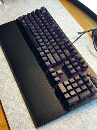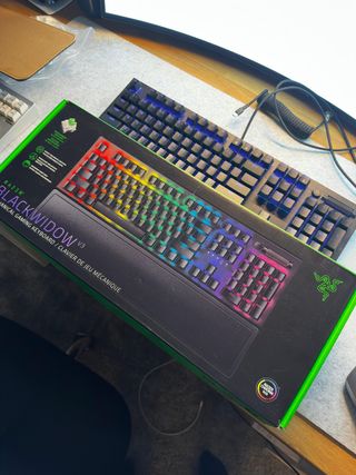 Teclado mecânico Razer Blackwidow V3 com layout americano. - Teclado com iluminação RGB. - Apoio de pulso incluído.