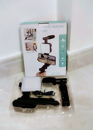Kit de vídeo-making modelo AY-49, totalmente novo e na caixa original. Ideal para YouTubers, TikTokers e criadores de conteúdo. Inclui: Tripé de mesa (estável e ergonómico). Microfone Shotgun com cancelamento de ruído (Jack 3.5mm). Luz LED ultra-brilhante (requer 2 pilhas AA). Suporte universal para telemóvel. Comando Bluetooth incluído. Perfeito para melhorar a qualidade das suas gravações com o telemóvel.