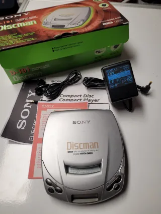 Leitor de CD portátil Sony Discman D-191, com embalagem original. - Inclui auscultadores estéreo. - Inclui adaptador de corrente AC. - Design compacto e leve. - Tecnologia Digital Mega Bass. - DAC de 1 bit. - AVLS (Sistema de Limite de Volume Automático).