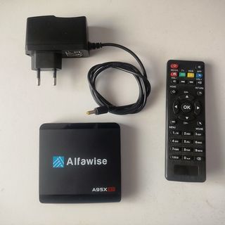Box Alfawise A95X R1 com 1GB de RAM e 8GB de ROM. - Inclui fonte de alimentação. - Inclui comando à distância.