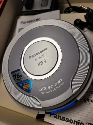 Leitor de CD portátil Panasonic SL-SX475 com reprodução de MP3. Inclui o motor Real Music Engine para uma experiência sonora de alta qualidade. - Até 75 horas de reprodução. - Compatível com formato MP3. - Design D.SOUND. Com carregador AC 4,5V #Oferta de fones de ouvido.