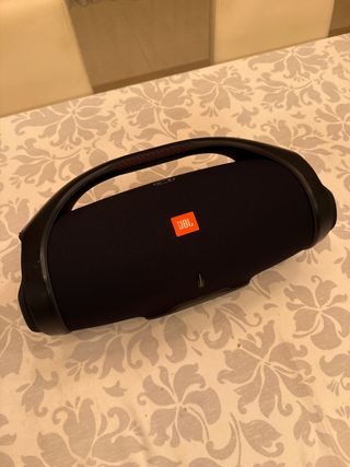 Coluna de som portátil JBL Boombox 2. Tem problema na motherboard, não liga, não carrega. Motherboard queimou os chips de amplificação. Não tem reparação pelo que me disseram. Sem devoluções. Bateria em perfeito estado, original, tal como as outras peças todas. Posso vender cada peça em separado. Carcaça, Bateria, Drivers - Cor preta. - Design robusto com alça para transporte.