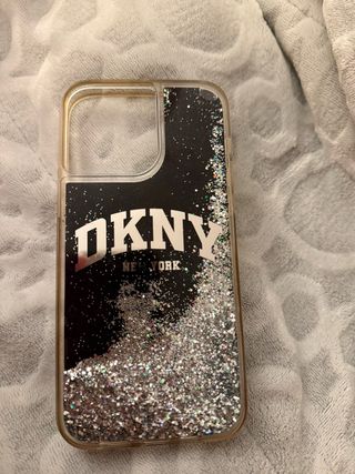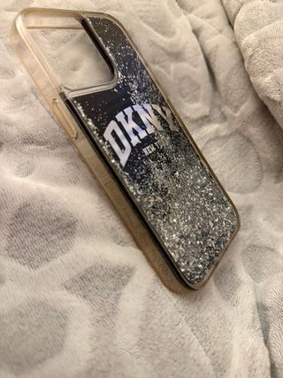 Capa protetora para iPhone 14 Pro Max com um design moderno e brilhante. - Parte traseira com glitter prateado e detalhes coloridos. - Logo DKNY New York em destaque na parte superior. - Laterais transparentes.