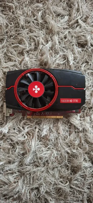Placa gráfica AMD com ventoinha. - Design com detalhes em vermelho. - Ventoinha central com logótipo.