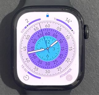 Smartwatch Apple Watch Series 10, tamanho 42mm, cor preta. - Caixa em alumínio. - Pulseira desportiva preta. - Ecrã Retina. - Resistente à água. - Bataria 99% e Garantia ate agosto 2026